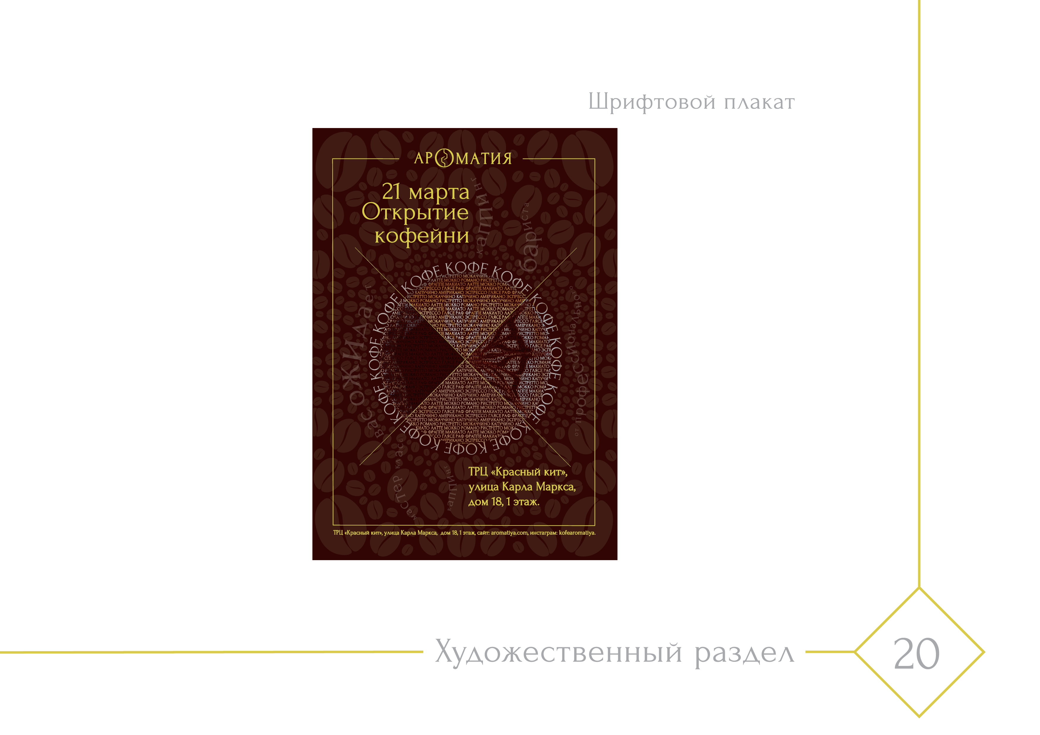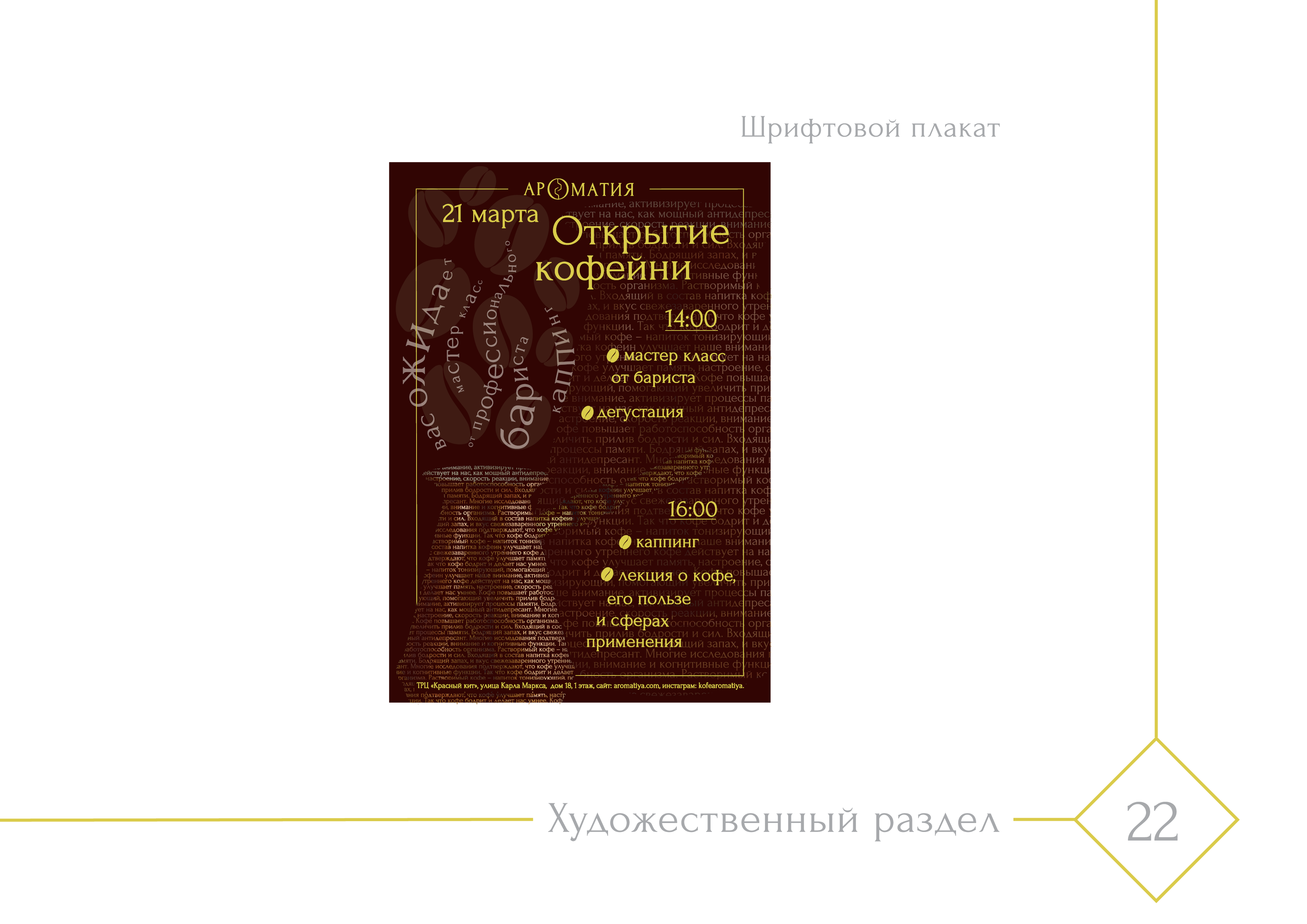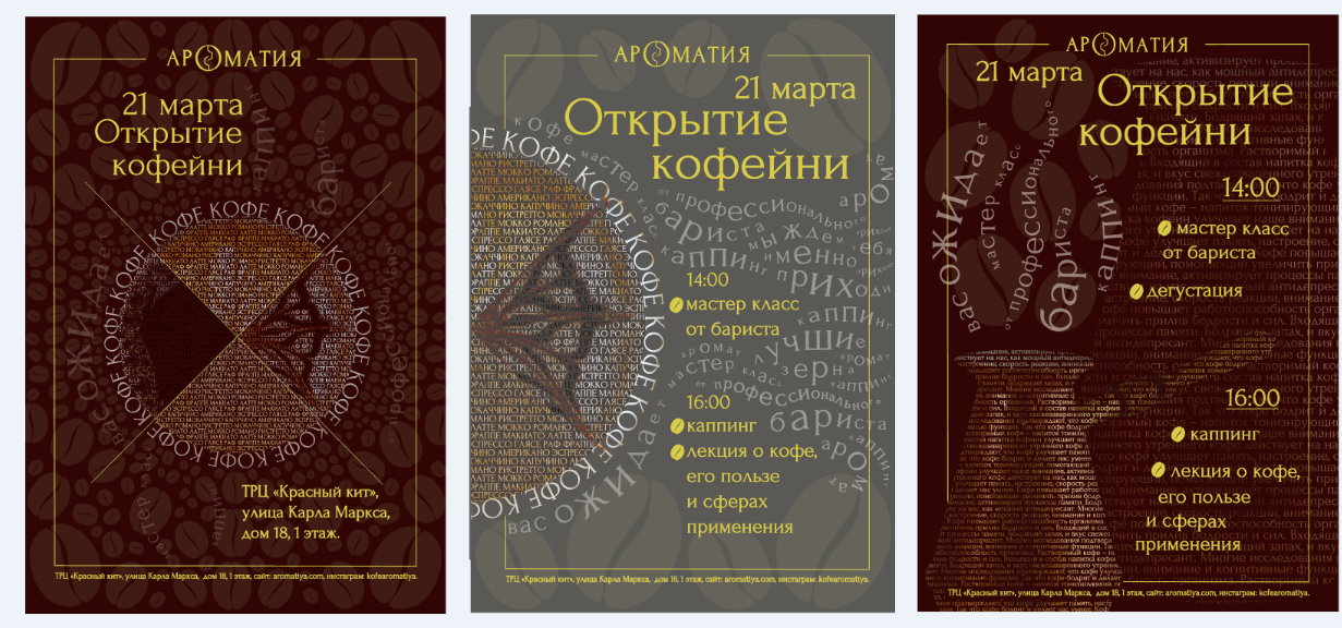 В данной работе студентка курса "Графический дизайн" изучила конкурентную среду, придумала название, разработала логотип и фирменный знак, дизайн визиток, сувенирной продукции и частично формы сотрудников (для официантов). Создала шрифтовые плакаты под открытие кофейни.