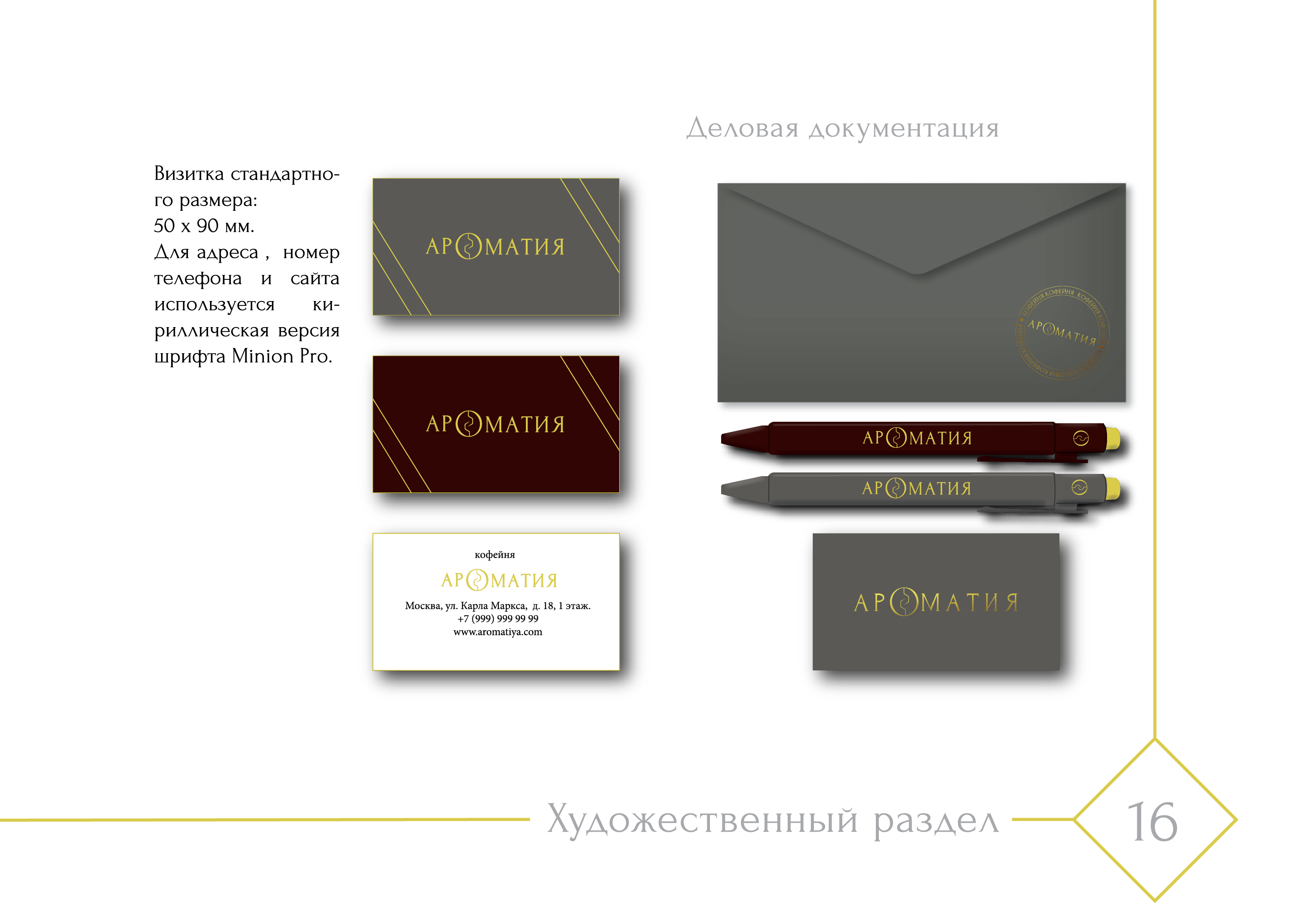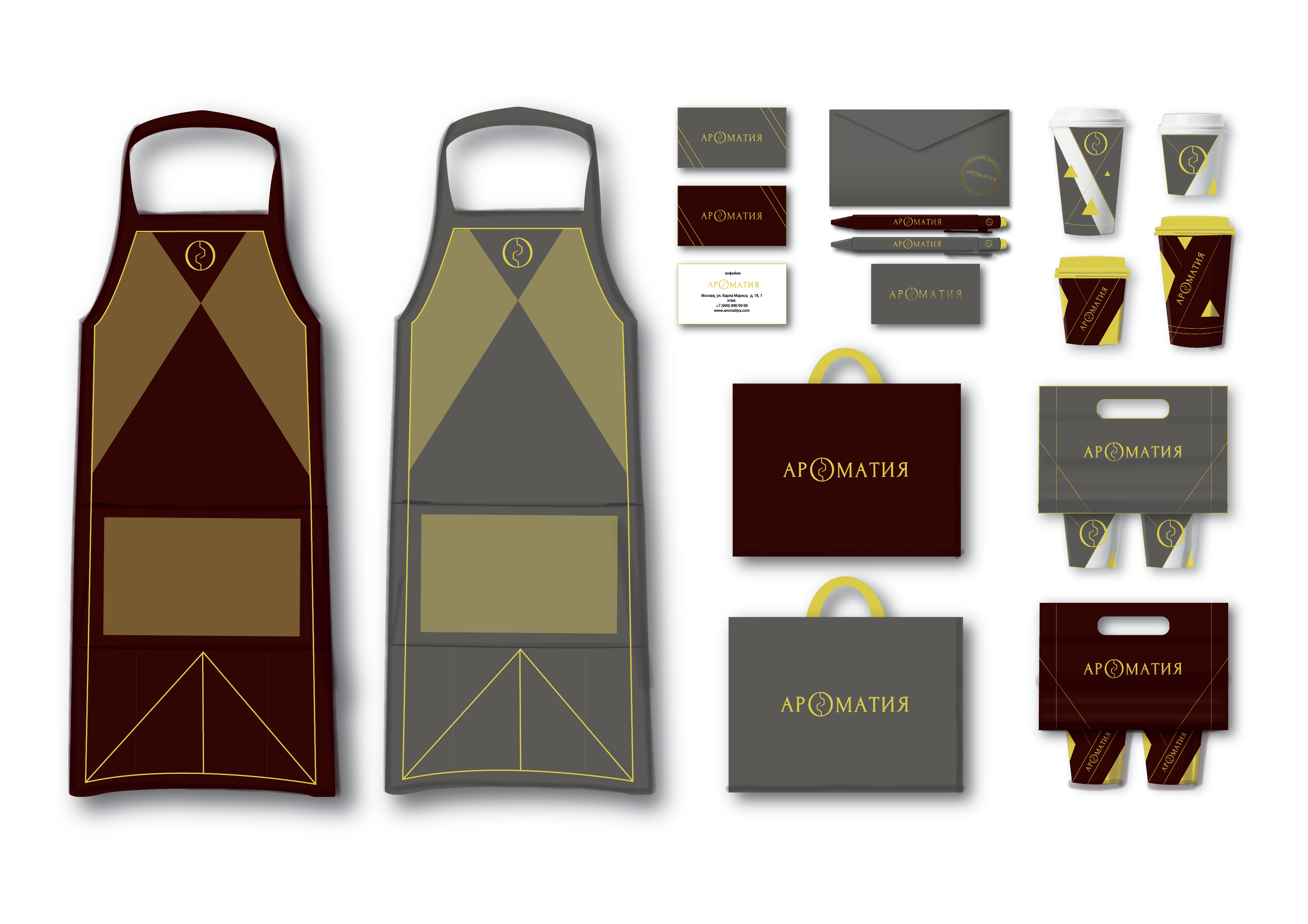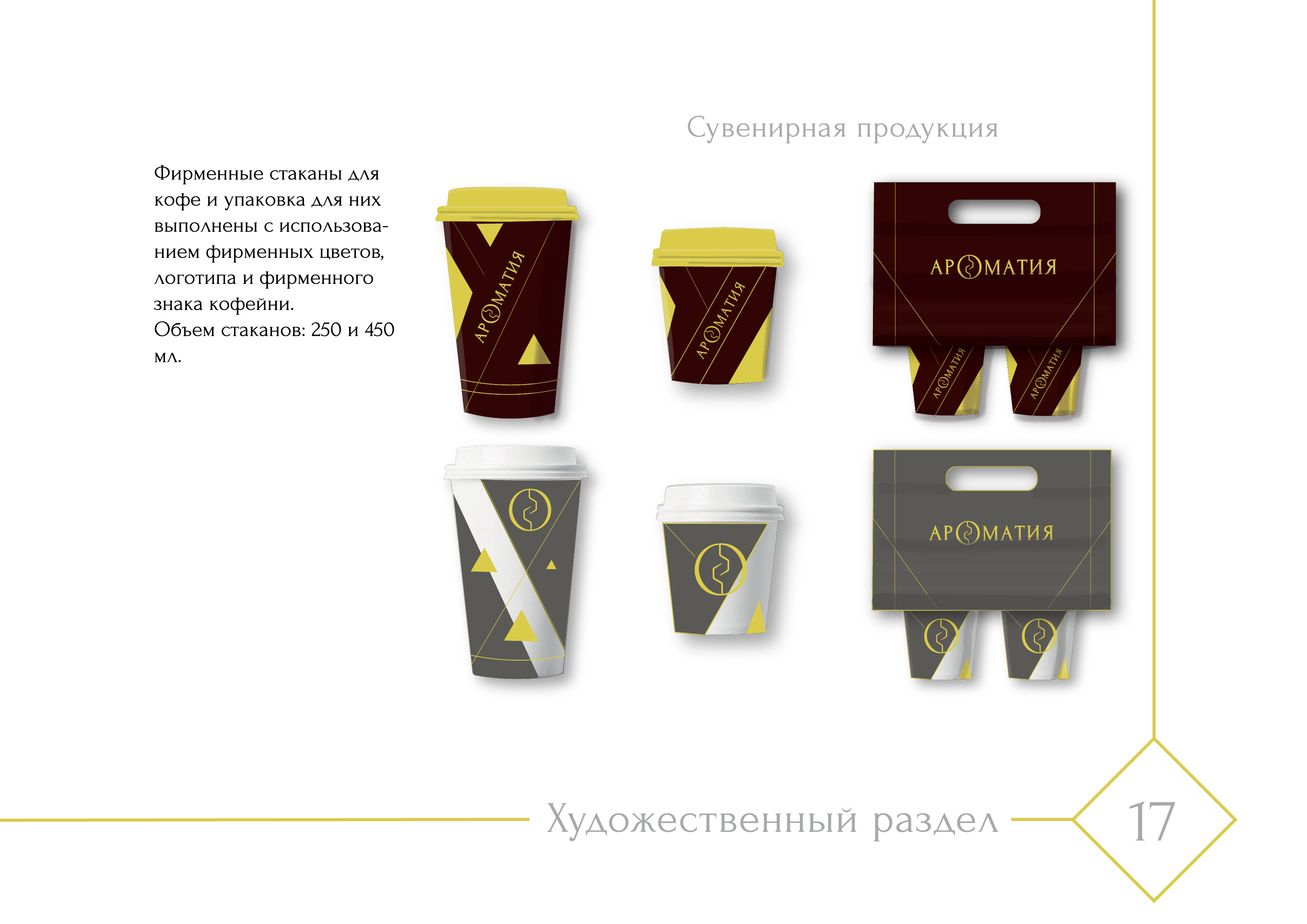 В данной работе студентка курса "Графический дизайн" изучила конкурентную среду, придумала название, разработала логотип и фирменный знак, дизайн визиток, сувенирной продукции и частично формы сотрудников (для официантов). Создала шрифтовые плакаты под открытие кофейни.